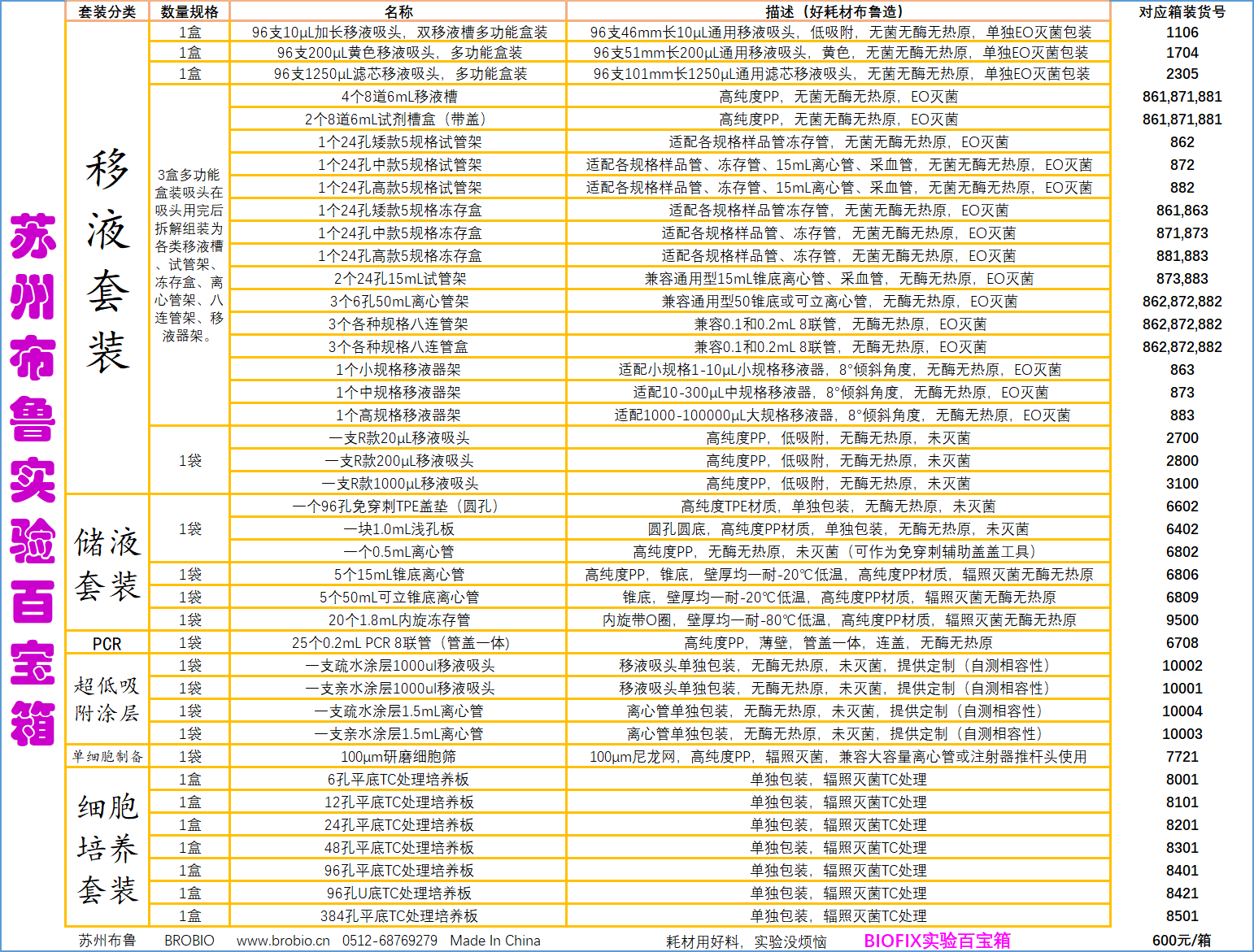 一箱包含十余种BROFIX专利创新产品,52 种、 2388 套/个常用实验室仪器和耗材,从研发到生产,应有尽有!急用无忧!