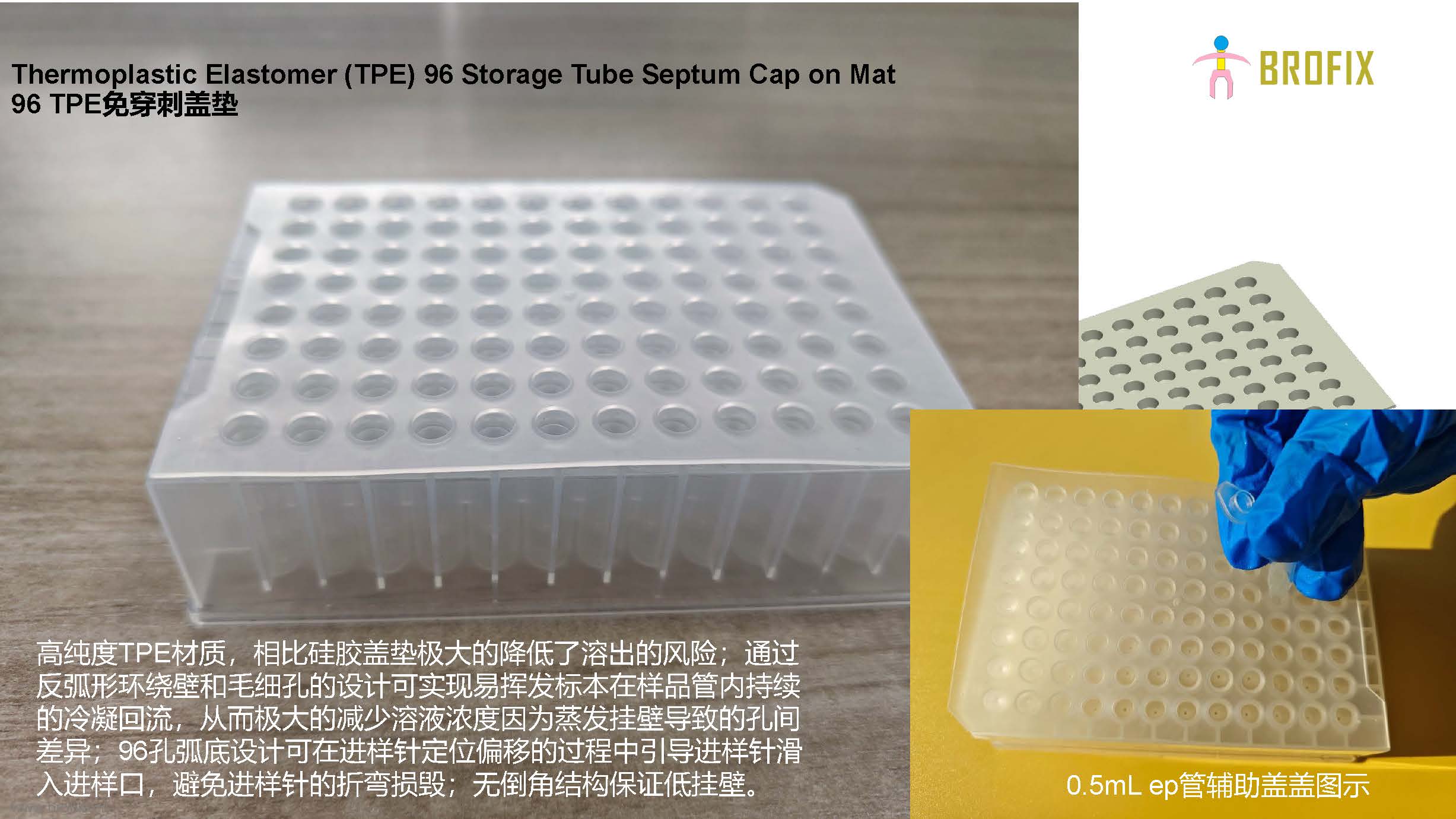 为了解决试剂挥发和进样针堵塞造成实验误差和异常曲线等难题,BROFIX苏州布鲁研发独特的免穿刺硅胶盖垫,采用高纯度TPE材质,相比硅胶盖垫极大的降低了溶出的风险;一种全新的防蒸发方法,基于道尔顿蒸发定律可以实现对试剂和样品冷凝气密封、有限液封和持续液封三类6种密封方式,恒定蒸气压实现稳定封密,方便快捷省成本;通过反弧形环绕壁和毛细孔的设计可实现易挥发标本在样品管内持续的冷凝回流,从而极大的减少溶液浓度因为蒸发挂壁导致的孔间差异;96孔弧底设计可在进样针定位偏移的过程中引导进样针滑入进样口,避免进样针的折弯损毁。目前提供96孔圆孔设计盖垫,推荐使用BROFIX配套96孔板系列保证充分完美的密封和冷凝回流效果。96孔方孔系列盖垫需OEM。