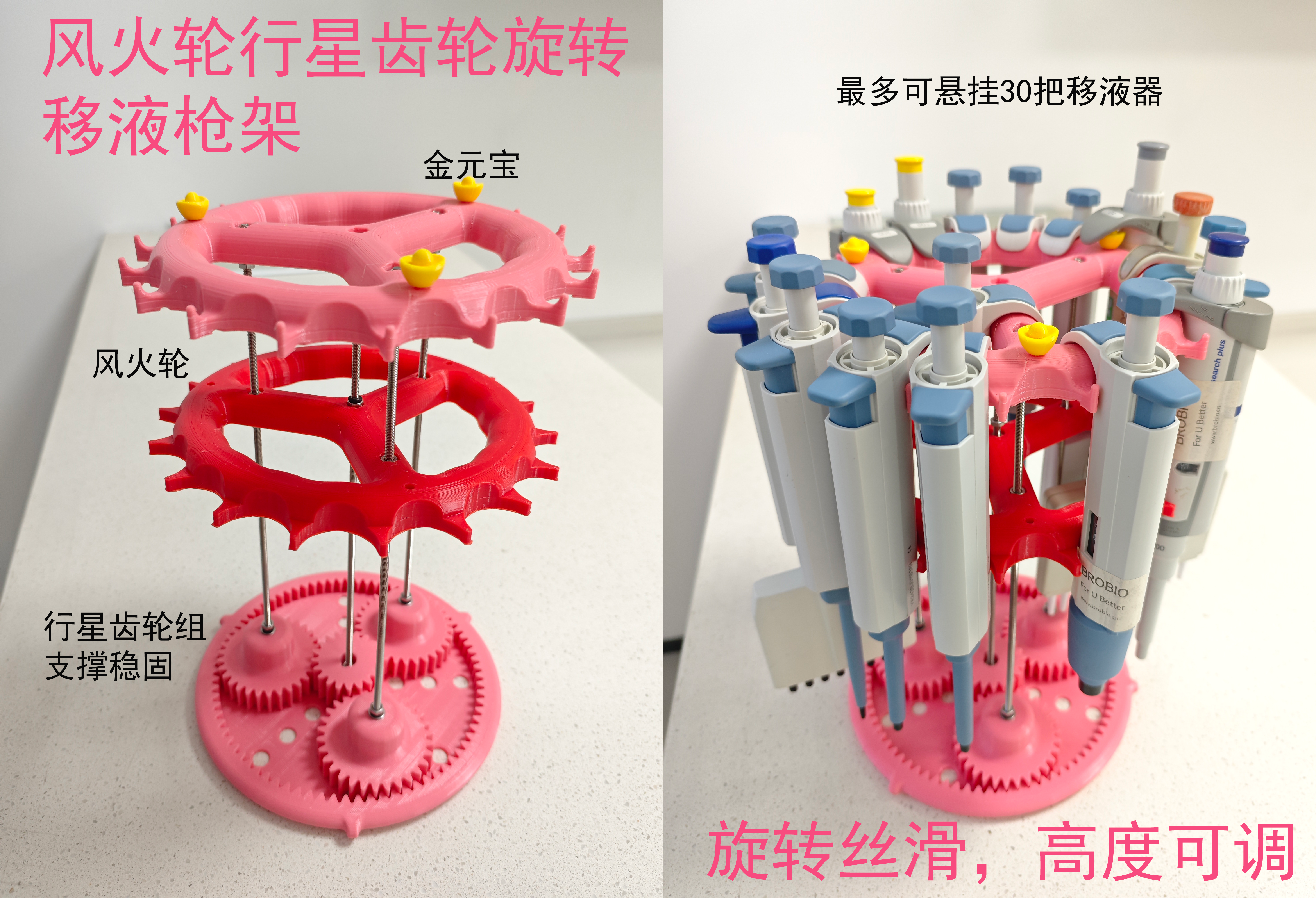 为了解决移液枪在取放的时候容易掉落等问题,苏州布鲁BROFIX基于行星齿轮组原理研发了三角固定的行星齿轮移液枪架。结构紧凑,活动式紧密固定不易磨损,最多可悬挂30把移液枪,多种旋转方式旋转丝滑,高度可调,顶部默认安装三个金元宝摆件,可定制其他如十二生肖摆件。