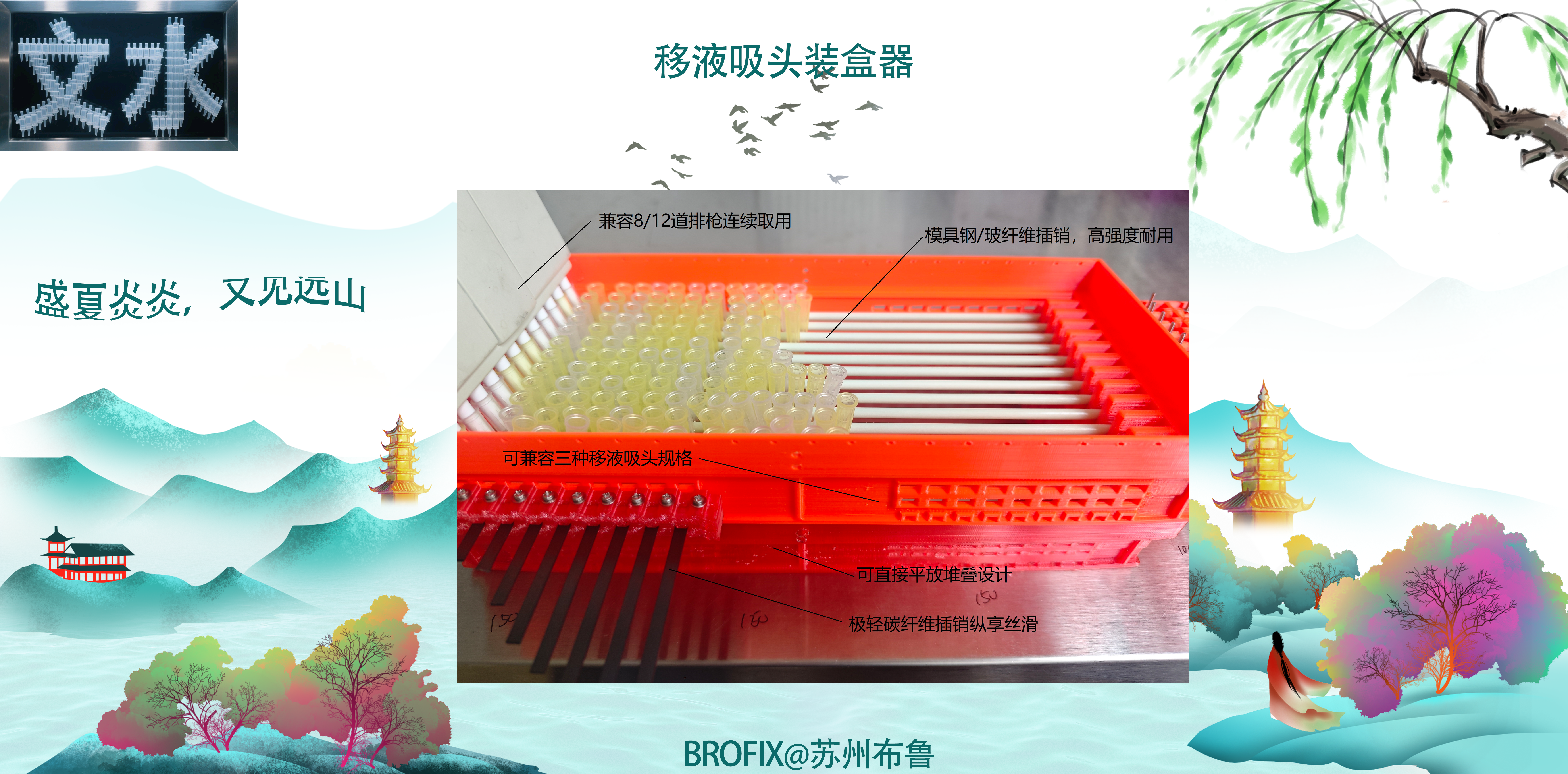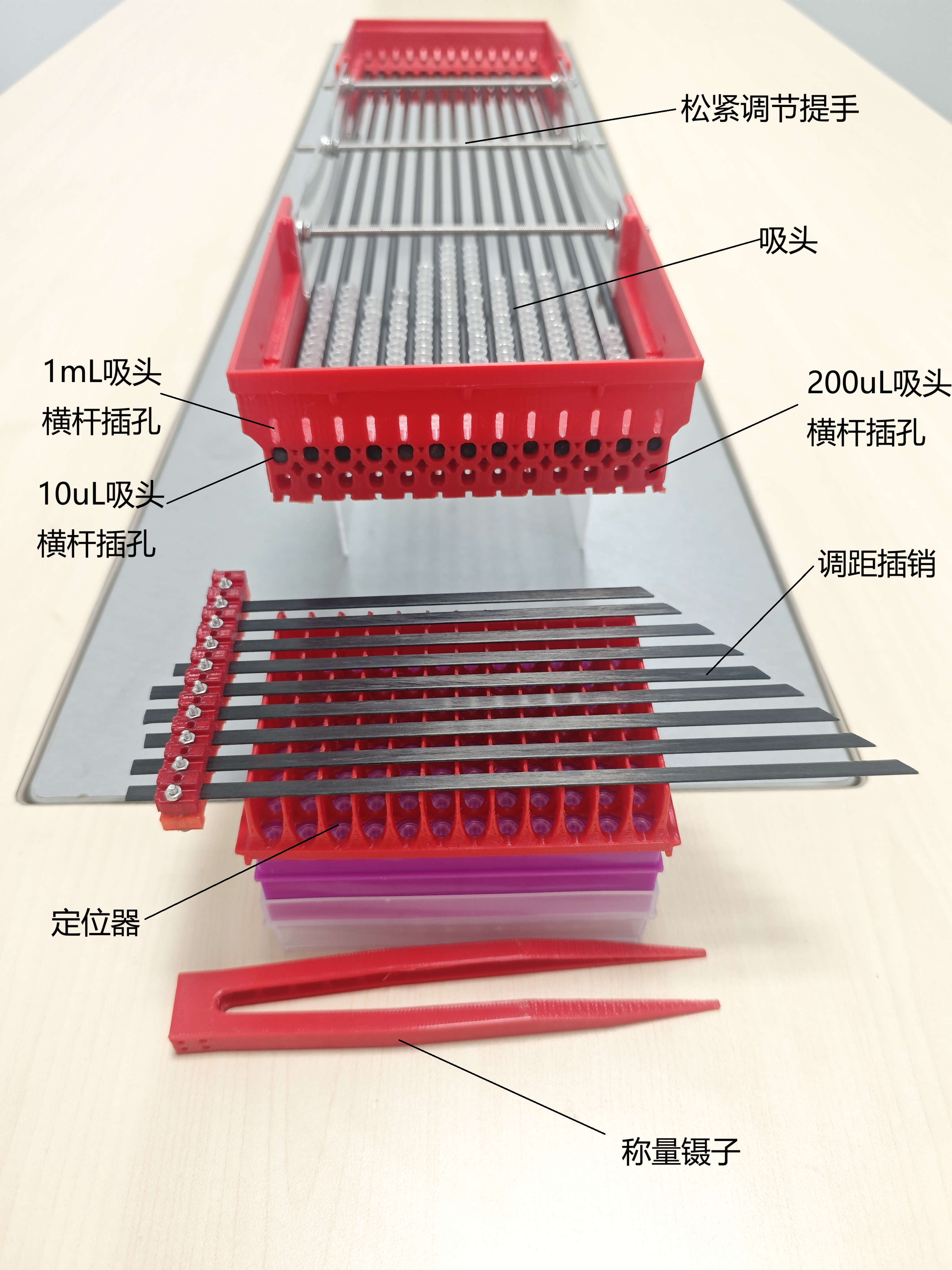 为了解决实验室散装吸头装盒工作量大、枯燥乏味等问题,BROFIX苏州布鲁结合3D打印、模具加工、碳纤维/玻纤维加工等工艺推出三种规格的移液吸头装盒器,一盒可兼容大中小三种规格吸头,总重量约300克,碳纤维/玻纤维横杆保证不掉移液吸头且移动平滑;优化的设计保证装盒器可堆叠直接平放桌面上进行操作;高强度的玻纤维横杆可实现单/8/12道移液器直接连续取用,无需装盒,操作更便捷。