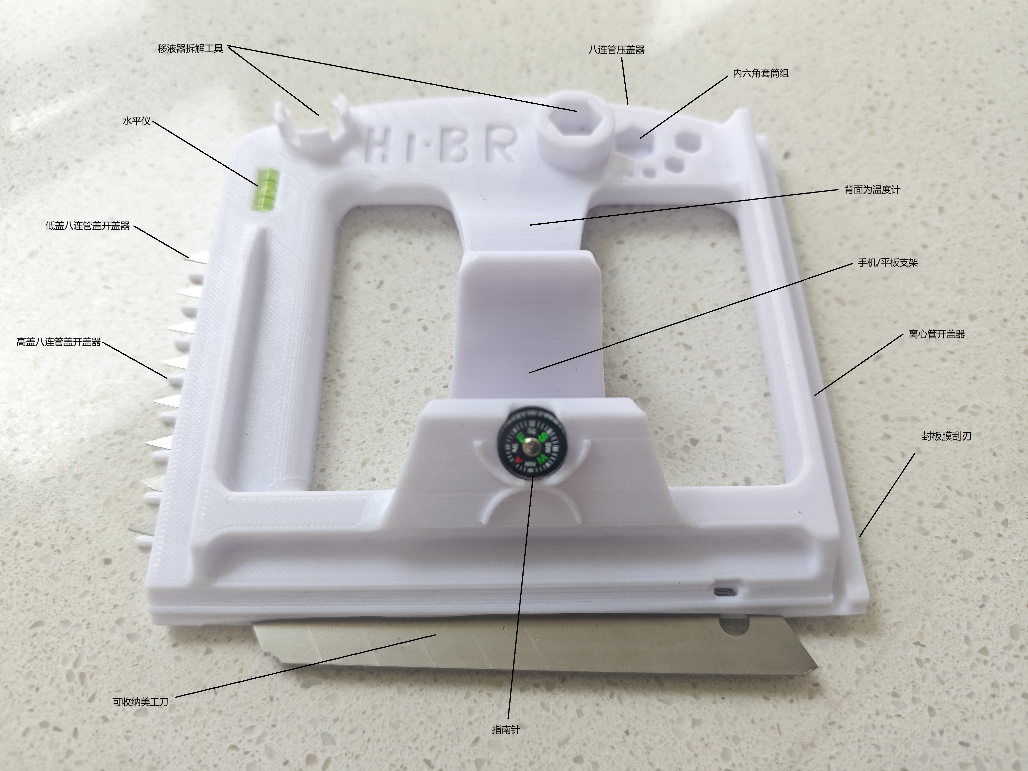 为了解决低盖八连管开盖和低温冰箱除冰难等难题,苏州布鲁BROFIX研发了HiBRO多功能工具板,集成移液器维修工具、高/低盖八连管开盖器、离心管开盖器、封板膜刮刃、水平仪、多凸起扳手、切割刀、手机/平板支架、内六角扳手套筒、温度计等常用工具功能。