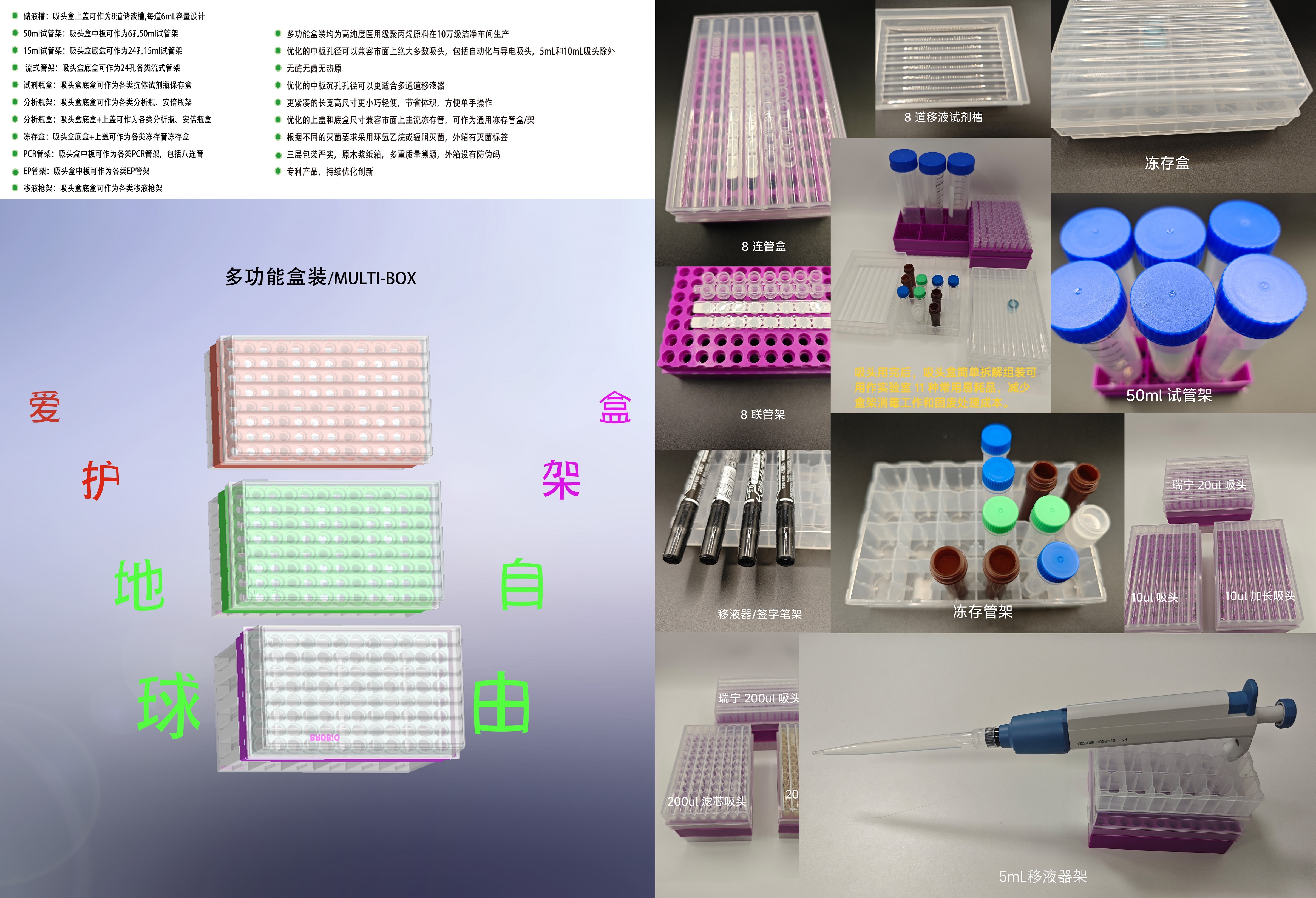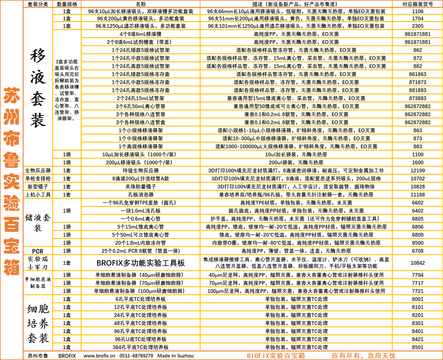一箱包含十余种BROFIX专利创新产品,52 种、 2388 套/个常用实验室仪器和耗材,从研发到生产,应有尽有!急用无忧!